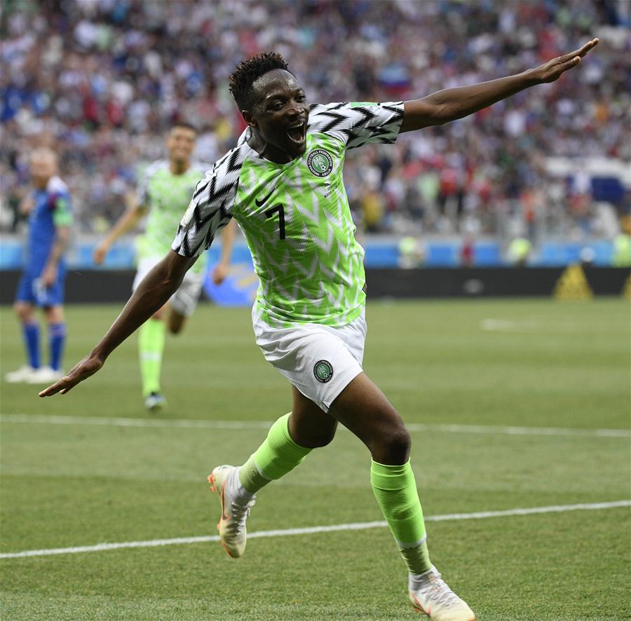 ↑6月22日,尼日利亚队球员穆萨在比赛中庆祝进球。当日,在伏尔加格勒进行的2018俄罗斯世界杯足球赛D组小组赛中,冰岛队对阵尼日利亚队。 新华社记者吕小炜摄