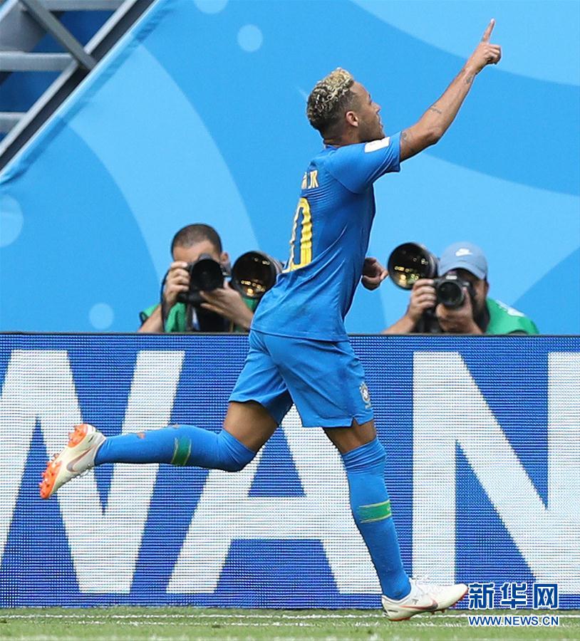↑6月22日,巴西队球员内马尔在比赛中庆祝进球。当日,在圣彼得堡进行的2018俄罗斯世界杯足球赛E组小组赛中,巴西队以2比0战胜哥斯达黎加队。 新华社记者徐子鉴摄
