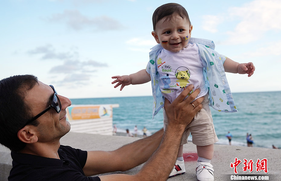 当地时间6月23日晚,德国队与瑞典队的比赛在索契举行。开赛前,两国球迷在海边相向而坐,各自聊天。图为七个月大的俄罗斯“小球迷”。 中新社记者 毛建军 摄