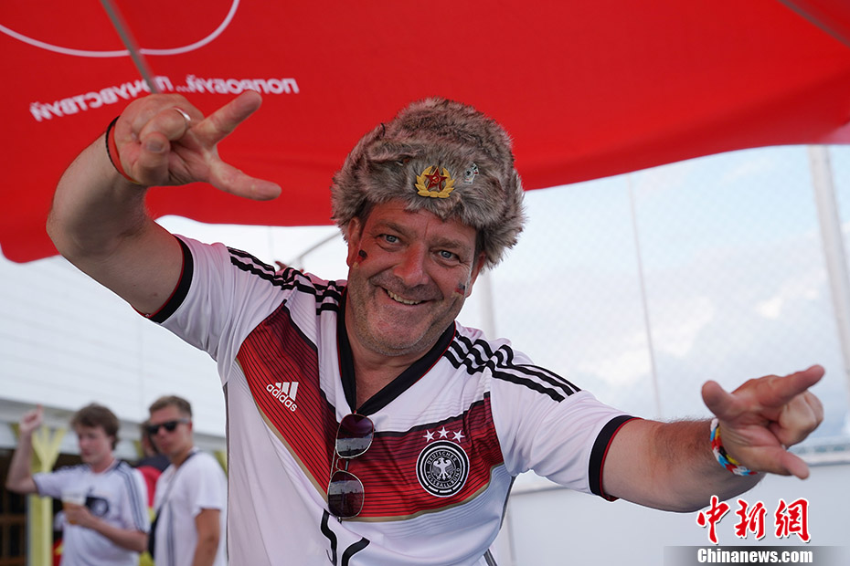 当地时间6月23日晚,德国队与瑞典队的比赛在索契举行。开赛前,两国球迷在海边相向而坐,各自聊天。图为德国球迷期盼胜利。 中新社记者 毛建军 摄