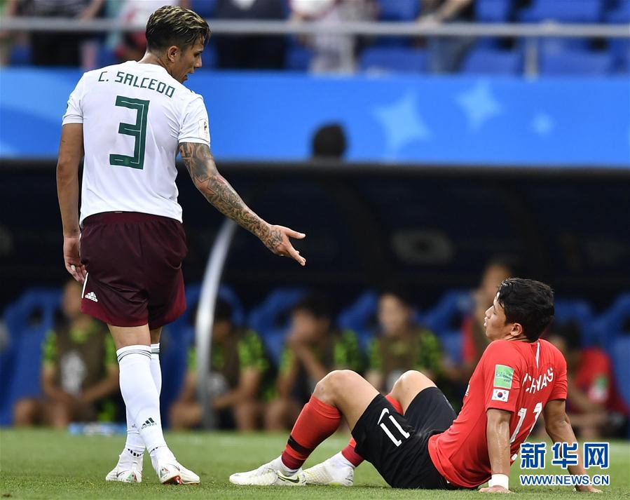 6月23日,墨西哥队球员萨尔塞多(左)在比赛后欲扶起韩国队球员黄喜灿。当日,在顿河畔罗斯托夫进行的2018俄罗斯世界杯足球赛F组小组赛中,墨西哥队以2比1战胜韩国队。 新华社记者陈益宸摄