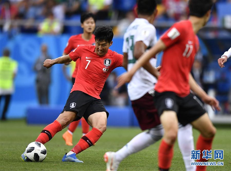 6月23日,韩国队球员孙兴民(左二)在比赛中射门。当日,在顿河畔罗斯托夫进行的2018俄罗斯世界杯足球赛F组小组赛中,墨西哥队以2比1战胜韩国队。 新华社记者陈益宸摄