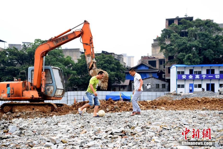 6月23日,39岁的挖掘机手杨玉祥在工地里和工友在玩足球。在贵州省榕江县车江千户侗寨里,有一支名为“快乐老男孩”的足球队。球队成立于2015年,现有43名成员,90%是当地的侗族,他们当中有挖掘机驾驶员、屠夫、鱼贩、烟酒店老板、建筑工人、小商贩等,球员平均年龄42.5岁。2017年6月,刚刚成立两年的“快乐老男孩”足球队,参加了榕江县首届足协杯,获得了冠军,激励了更多的当地人参加足球运动。时下,俄罗斯世界杯鏖战正酣,球员们白天各自工作,晚上聚在一起看世界杯。当日,是“快乐老男孩”足球队参加榕江县周末足球联赛本赛季的最后一场比赛,他们完成白天的工作后换上球衣,走上绿茵场,为比赛奔跑。 中新社发 王炳真 摄