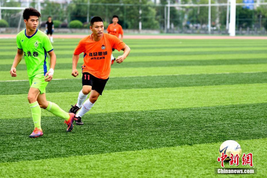 6月23日,44岁的鱼贩李勇利(右)在球场上比赛。在贵州省榕江县车江千户侗寨里,有一支名为“快乐老男孩”的足球队。球队成立于2015年,现有43名成员,90%是当地的侗族,他们当中有挖掘机驾驶员、屠夫、鱼贩、烟酒店老板、建筑工人、小商贩等,球员平均年龄42.5岁。2017年6月,刚刚成立两年的“快乐老男孩”足球队,参加了榕江县首届足协杯,获得了冠军,激励了更多的当地人参加足球运动。时下,俄罗斯世界杯鏖战正酣,球员们白天各自工作,晚上聚在一起看世界杯。当日,是“快乐老男孩”足球队参加榕江县周末足球联赛本赛季的最后一场比赛,他们完成白天的工作后换上球衣,走上绿茵场,为比赛奔跑。 中新社发 王炳真 摄