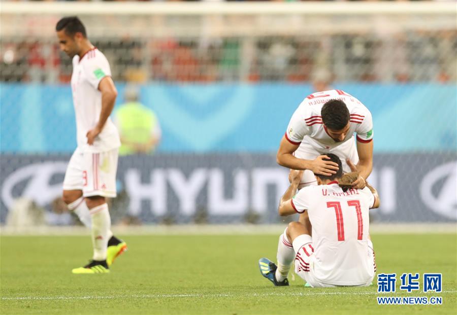 6月25日,伊朗队球员汉扎德(右上)与队友阿米里(右下)在比赛后相互安慰。当日,在萨兰斯克进行的2018俄罗斯世界杯足球赛B组小组赛中,葡萄牙队以1比1战平伊朗队,以小组第二名的成绩出线。 新华社记者 费茂华 摄