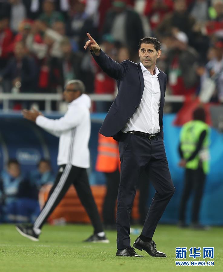 6月25日,西班牙队主教练费尔南多·耶罗在场边指挥。当日,在加里宁格勒进行的2018俄罗斯世界杯足球赛B组小组赛中,西班牙队以2比2战平摩洛哥队,西班牙队以小组第一的成绩晋级十六强。新华社记者 鲁金博 摄