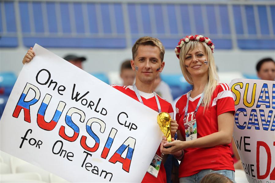 6月25日,两名俄罗斯队球迷在比赛前造势。当日,在萨马拉进行的2018俄罗斯世界杯足球赛A组小组赛中,乌拉圭队对阵俄罗斯队。 新华社记者白雪骐摄