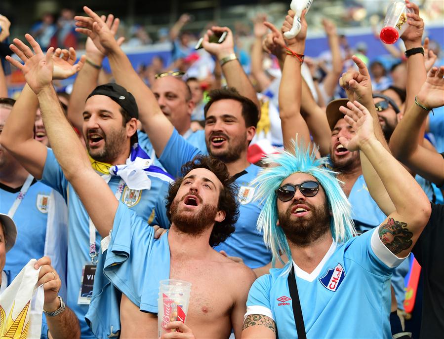 6月25日,乌拉圭队球迷在比赛前造势。当日,在萨马拉进行的2018俄罗斯世界杯足球赛A组小组赛中,乌拉圭队对阵俄罗斯队。 新华社记者杜宇摄