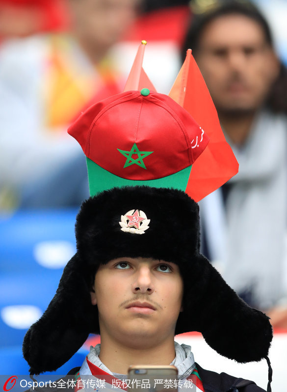 摩洛哥球迷头顶国徽认真观赛