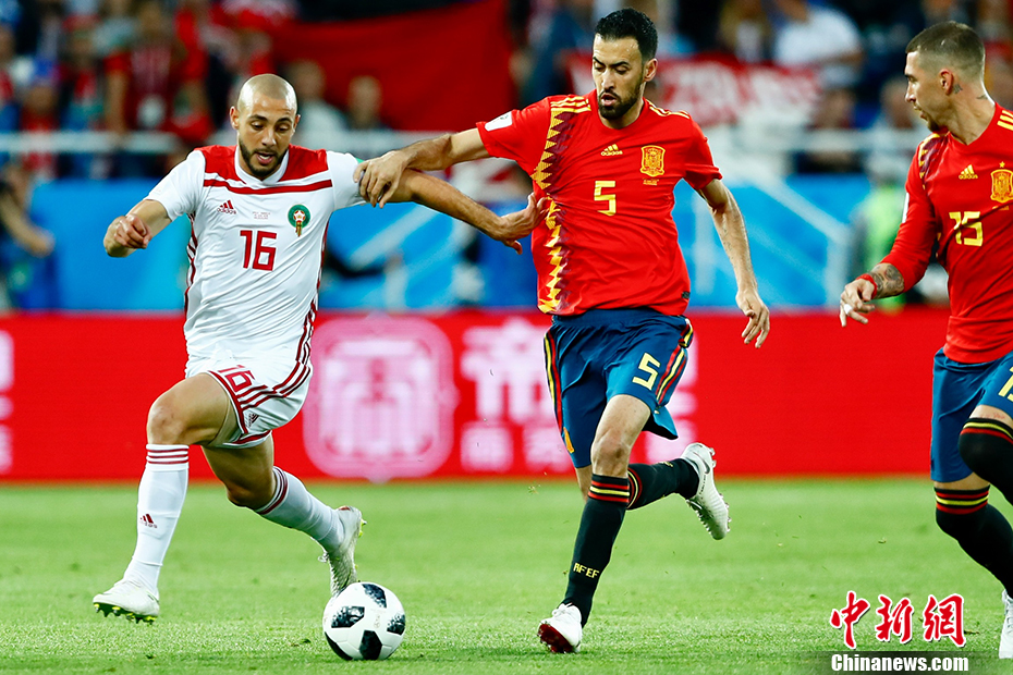 北京时间6月26日凌晨,俄罗斯世界杯B组小组赛打响收官之战,西班牙面对已经提前出局的摩洛哥并没能讨得什么便宜,两度在落后的情况下两度扳平,最终2-2与对手握手言和。西班牙1胜2平,凭借进球优势力压葡萄牙,以小组第一的身份出线。 中新社记者 富田 摄