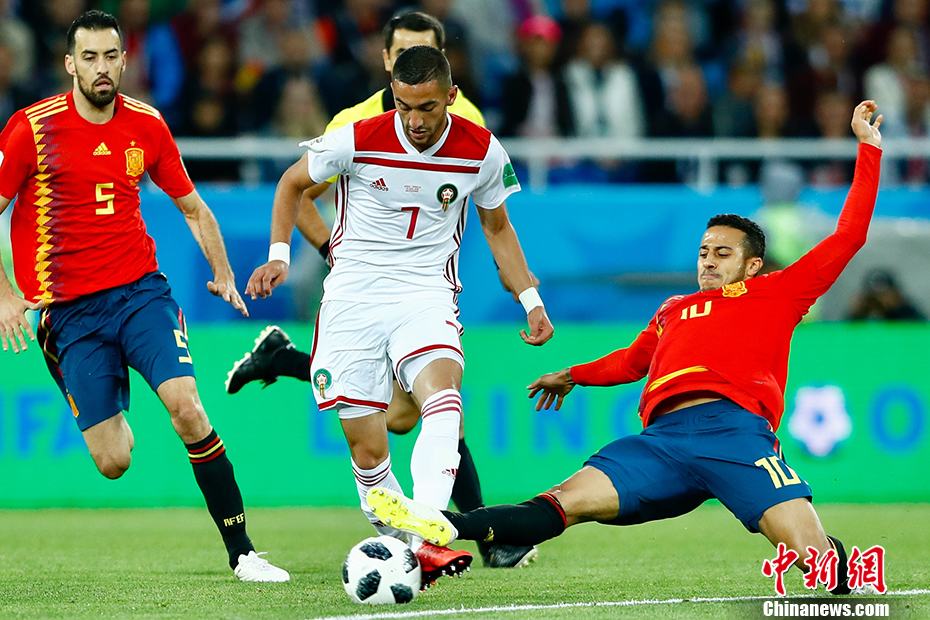 西班牙世界杯开赛前临阵换帅,让不少评论都认为他们的整体战斗力将受到影响。不过世界杯首战,他们虽然遭遇到了强有力的考验,但仍然全身而退。面对有C罗领军的葡萄牙,西班牙曾经两度落后,但都顽强的将比分扳平。虽然凭借纳乔的远射破门反超比分,但临近终场时C罗直接任意球破门,让两队互取1分。 中新社记者 富田 摄
