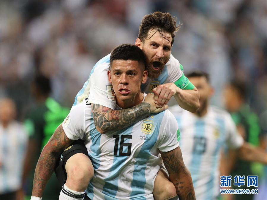 6月26日,阿根廷队球员罗霍(左)进球后与队友梅西庆祝。当日,在圣彼得堡进行的2018俄罗斯世界杯足球赛D组小组赛中,尼日利亚队对阵阿根廷队。 新华社记者杨磊摄