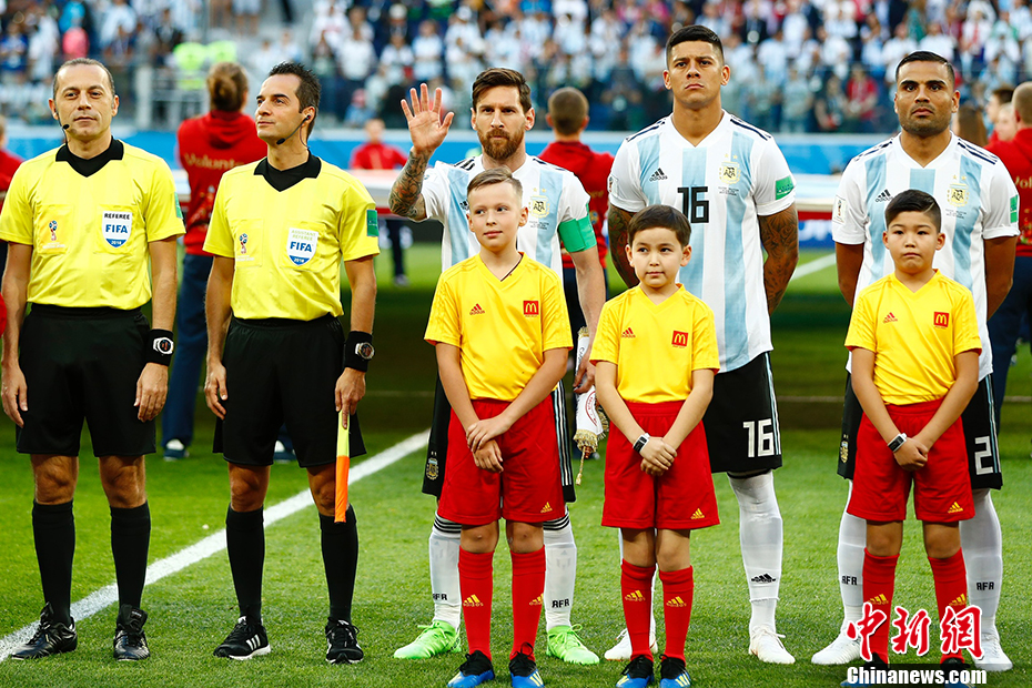 北京时间6月27日凌晨,2018俄罗斯世界杯D组阿根廷与尼日利亚的“生死战”在圣彼得堡新泽尼特体育场打响。梅西、罗霍建功,阿根廷队2-1战胜尼日利亚。在D组同时进行的另一场比赛中,克罗地亚2-1战胜冰岛,克罗地亚、阿根廷分列D组第一第二晋级16强。阿根廷将与C组第一法国队争夺一个8强席位。 中新社记者 富田 摄