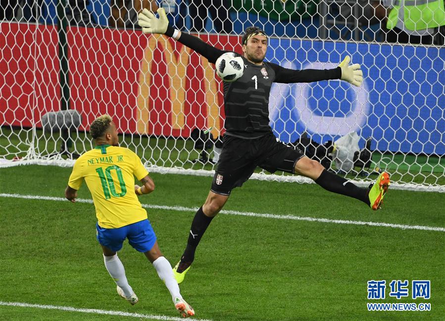 6月27日,塞尔维亚队门将斯托伊科维奇(右)在比赛中封堵巴西队球员内马尔的射门。当日,在莫斯科进行的的2018俄罗斯世界杯足球赛E组小组赛中,巴西队以2比0战胜塞尔维亚队,位列小组第一晋级十六强。新华社记者王毓国摄