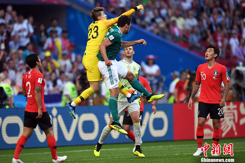 北京时间6月27日晚,2018俄罗斯世界杯F组韩国队与卫冕冠军德国队的比赛在喀山竞技场打响。最终,韩国2:0完胜德国队,在另外一边的比赛中,瑞典3:0完胜墨西哥。瑞典与墨西哥队分列小组第一、第二,携手晋级16强。卫冕冠军德国队遗憾出局。 中新社记者 田博川 摄