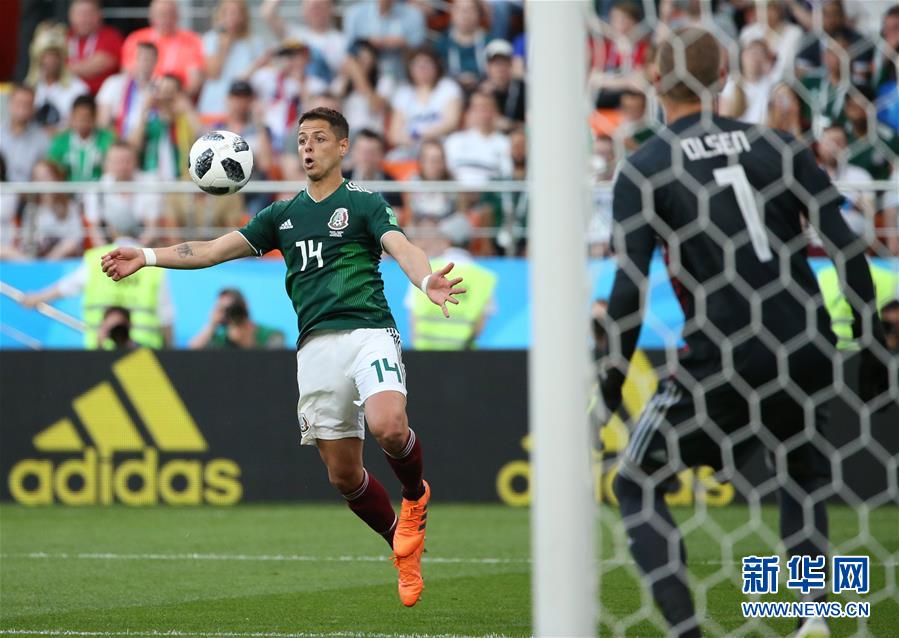 6月27日,墨西哥队球员埃尔南德斯(左)在比赛中控球。当日,在叶卡捷琳堡进行的2018俄罗斯世界杯足球赛F组小组赛中,瑞典队以3比0战胜墨西哥队,两队携手晋级十六强。 新华社记者 李明 摄