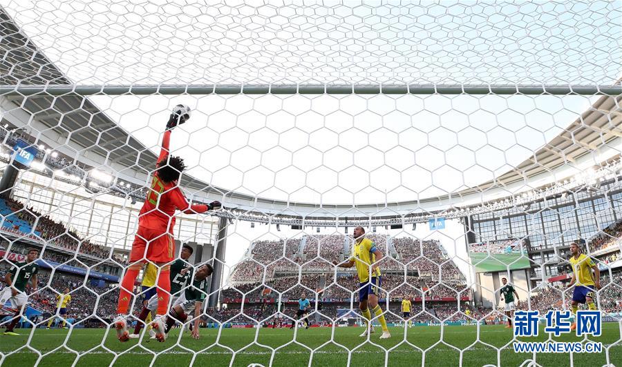 6月27日,墨西哥队守门员奥乔亚(左)在比赛中扑救。当日,在叶卡捷琳堡进行的2018俄罗斯世界杯足球赛F组小组赛中,瑞典队以3比0战胜墨西哥队,两队携手晋级十六强。 新华社记者 李明 摄