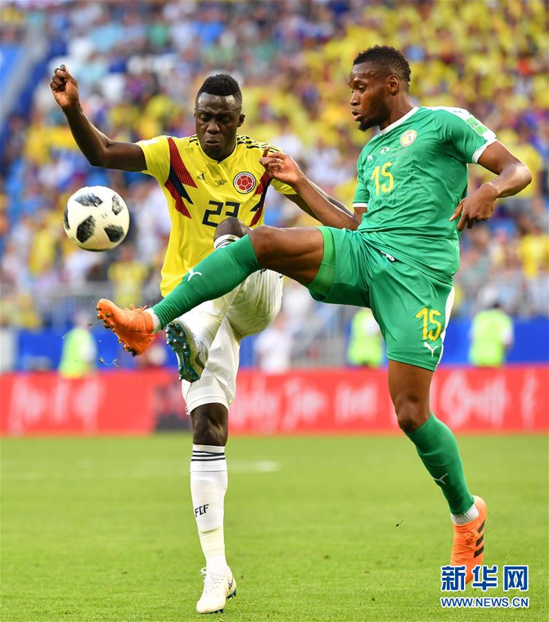 6月28日,哥伦比亚队球员戴·桑切斯(左)与塞内加尔队球员迪·萨科。当日,在萨马拉进行的2018俄罗斯世界杯足球赛H组小组赛中,哥伦比亚队以1比0战胜塞内加尔队,以小组第一的成绩晋级十六强。新华社记者刘大伟摄