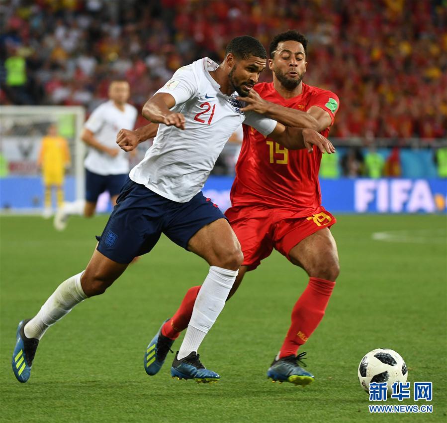 6月28日,英格兰队球员奇科(左)与比利时队球员穆·登贝莱在比赛中拼抢。当日,在加里宁格勒进行的2018俄罗斯世界杯足球赛G组小组赛中,比利时队以1比0战胜英格兰队,两队携手晋级十六强。 新华社记者杜宇摄