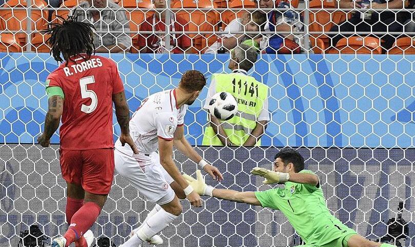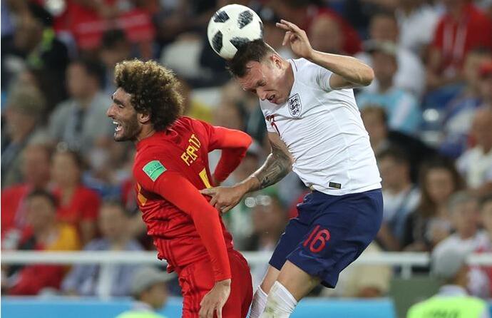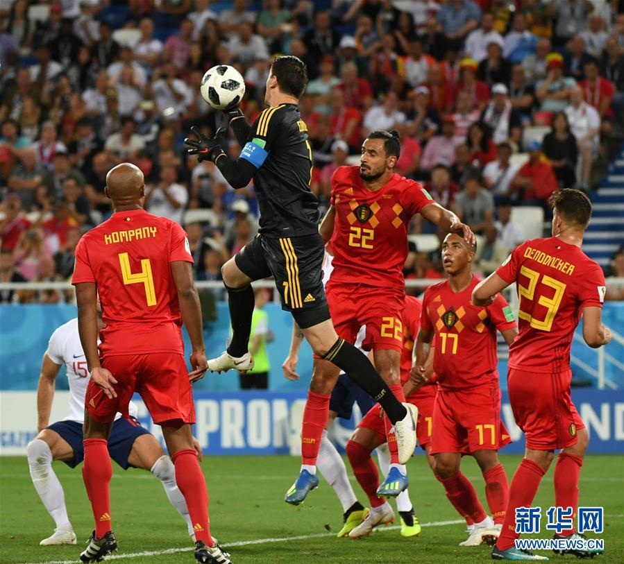 6月28日,比利时队门将库尔图瓦(中)在比赛中跃起扑救。当日,在加里宁格勒进行的2018俄罗斯世界杯足球赛G组小组赛中,比利时队以1比0战胜英格兰队,两队携手晋级十六强。 新华社记者杜宇摄