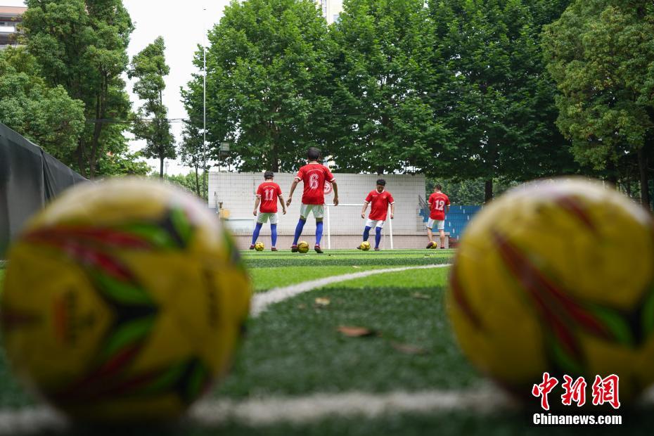6月29日,贵阳市盲人足球队在贵州特教中职校进行训练。当日,位于贵阳市观山湖区的贵州特殊教育中等职业技术学校球场内,由10名盲人学生组成的贵阳市首支盲人足球队开始了他们的暑期训练,队员中年纪最大的38岁,最小的18岁,他们需要佩戴眼罩,用耳朵听球辨别方向,完成停球、运球、射门等动作。2018年4月,贵州特殊教育中等职业技术学校作为贵州省残疾人体育训练基地,首次开设盲人足球课,成立贵阳首支正规化盲人足球队。中新社记者 贺俊怡 摄