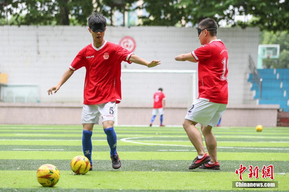 6月29日,贵州特教中职校球场里,盲人足球队员在进行一对一攻防练习。当日,位于贵阳市观山湖区的贵州特殊教育中等职业技术学校球场内,由10名盲人学生组成的贵阳市首支盲人足球队开始了他们的暑期训练,队员中年纪最大的38岁,最小的18岁,他们需要佩戴眼罩,用耳朵听球辨别方向,完成停球、运球、射门等动作。2018年4月,贵州特殊教育中等职业技术学校作为贵州省残疾人体育训练基地,首次开设盲人足球课,成立贵阳首支正规化盲人足球队。中新社记者 贺俊怡 摄