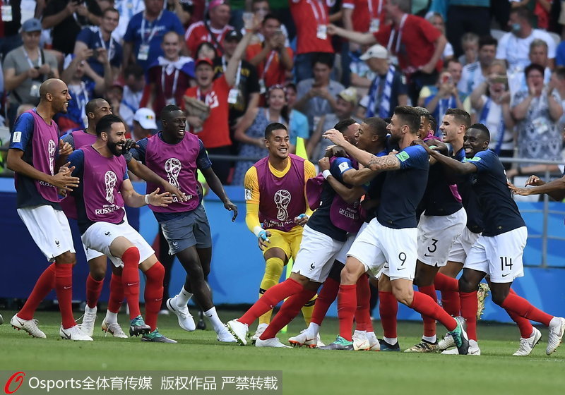 人民网北京6月30日电(赵欣悦) 北京时间6月30日22时,2018俄罗斯世界杯展开了1/8决赛的比赛,首场比赛便是法国和阿根廷两支夺冠热门的较量。经过90分钟的激战,法国队以4-3击败阿根廷,昂首晋级世界杯八强。上半场比赛,格列兹曼通过点球为法国队先进一球,阿根廷的迪玛利亚在上半场临近结束时贡献一记世界波为阿根廷队扳平比分。下半场比赛刚开场,梅西远射,球折射到梅尔卡多腿上弹入球门,阿根廷队2-1反超比分。接下来的比赛,法国队小将姆巴佩表现抢眼,他两次洞穿阿根廷大门,帮助法国以4-2反超比分。尽管在伤停补时阶段,阿根廷的阿奎罗为球队扳回一分,但这并未能改变球队落败的命运,最终法国队4-3淘汰阿根廷。(Osports全体育传媒专供人民体育 版权作品 严禁转载)