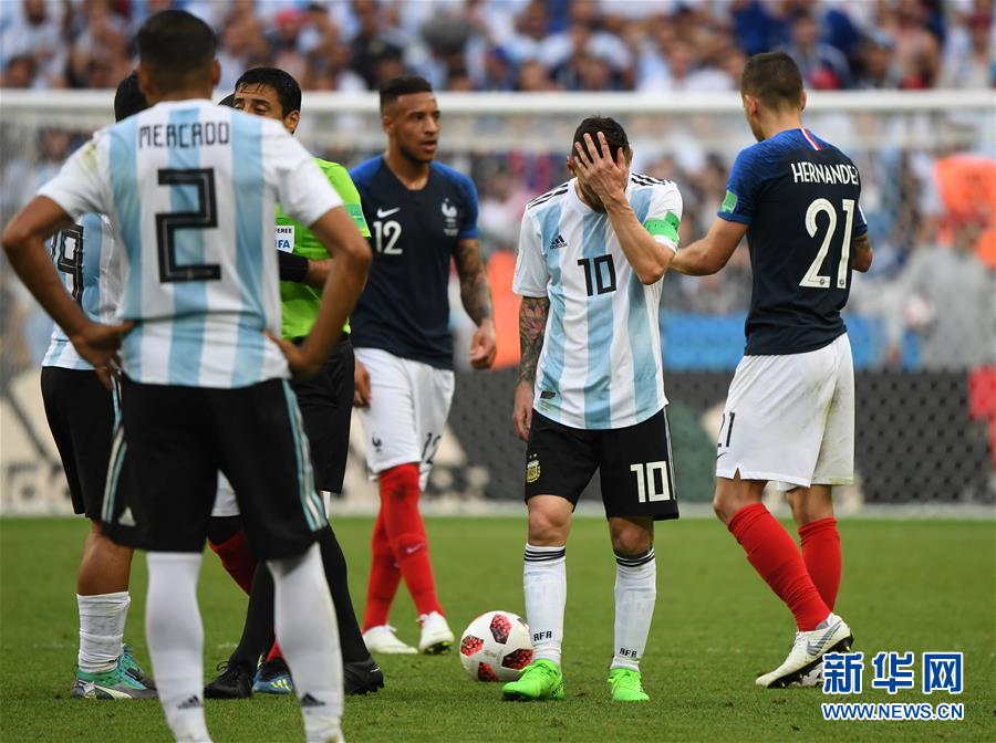 6月30日,阿根廷队球员梅西(右二)在比赛中神情沮丧。 新华社记者 李尕 摄
