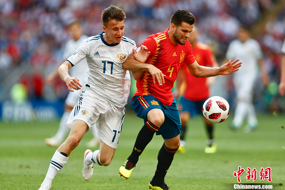 进入加时赛后,西班牙攻势不减,俄罗斯队员体力消耗极大。俄罗斯门将阿金费耶夫依旧多次化解危机。最终在本场比赛120分钟的时间内,双方战成1比1平。比赛进入残酷的点球大战,这也是本届杯赛第一次出现点球大战。图为戈洛文在赛场上。 中新社记者 富田 摄