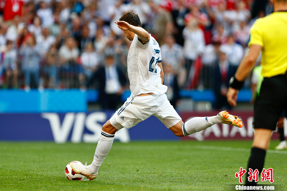 第40分钟,俄罗斯队获得角球机会,萨梅多夫开出角球,大中锋久巴头球攻门,西班牙后卫皮克禁区内手球,因阻挡了足球方向,主裁判毫不犹豫判罚了点球,皮克上前理论,吃到一张黄牌。久巴主罚命中,东道主扳平比分,1:1。久巴再次上演霸气敬礼的庆祝动作。 中新社记者 富田 摄