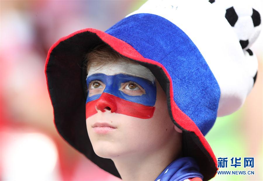 7月1日,一名俄罗斯队小球迷在比赛前。当日,在莫斯科进行的2018俄罗斯世界杯足球赛八分之一决赛中,西班牙队对阵俄罗斯队。 新华社记者吴壮摄