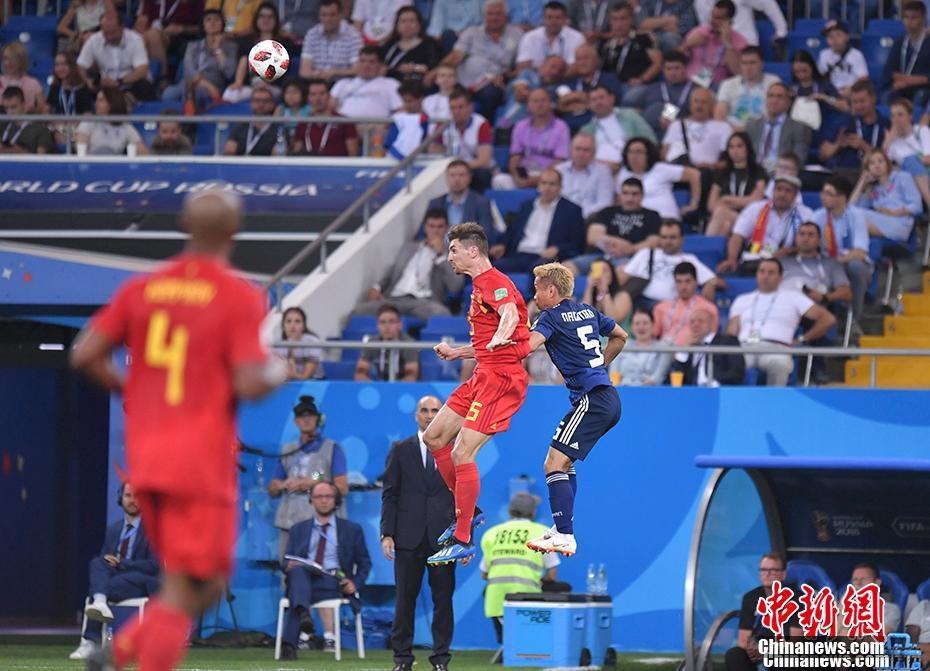 第93分钟,本田圭佑的超远距离任意球攻门被库尔图瓦扑出。就在补时的最后一分钟,比利时上演绝杀。库尔图瓦发动快攻,德布劳内直塞右侧的默尼耶,后者带球传中,库卡库中路吸引对手后将球漏过,后点无人看防的查德利推射空门入网,3:2,比利时完成惊天大逆转。 中新社记者 田博川 摄