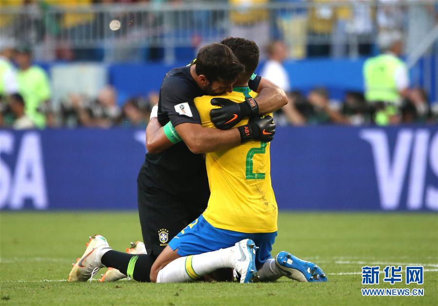 7月2日,巴西队球员蒂·席尔瓦(右)与守门员阿利松在比赛中庆祝队友菲尔米诺进球。当日,在萨马拉进行的2018俄罗斯世界杯足球赛八分之一决赛中,巴西队以2比0战胜墨西哥队,晋级八强。 新华社记者李明摄