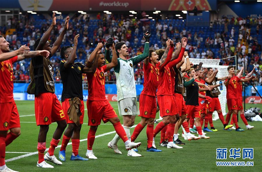 7月2日,比利时队球员庆祝胜利。当日,在顿河畔罗斯托夫进行的2018俄罗斯世界杯足球赛八分之一决赛中,比利时队以3比2战胜日本队,挺进八强。 新华社记者费茂华摄