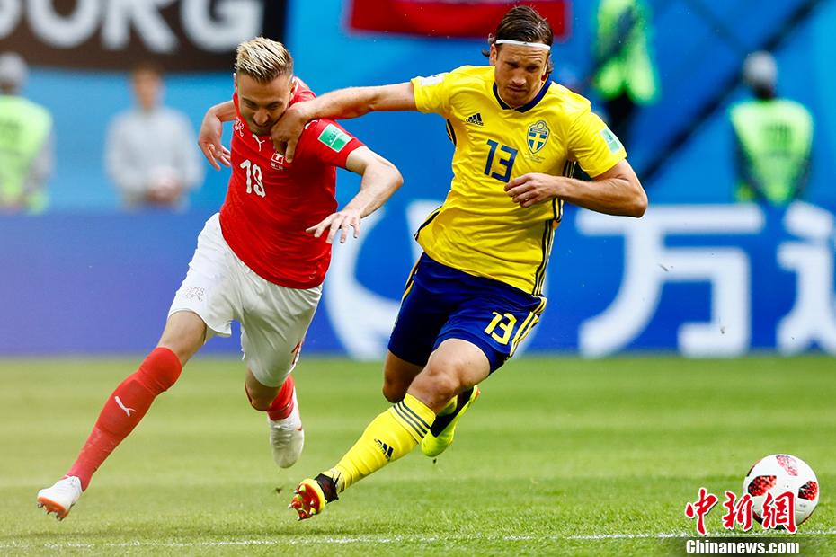 北京时间7月3日22:00,俄罗斯世界杯一场1/8决赛在圣彼得堡的新泽尼特体育场打响,最终凭借着福斯贝里的进球,瑞典队以1:0战胜瑞士队,顺利挺进八强。 中新社记者 富田 摄