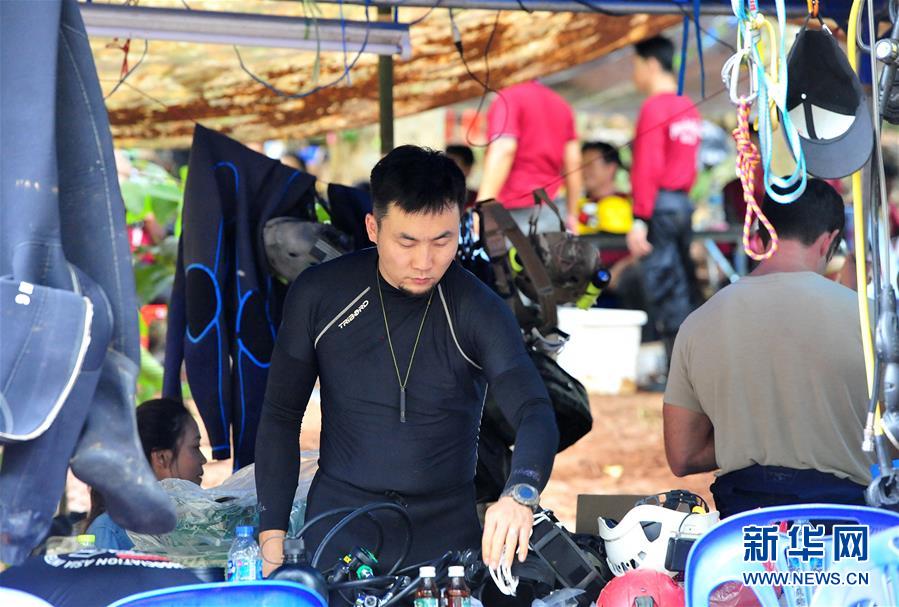 7月5日,在泰国清莱,一名来自中国的救援队成员准备潜入洞穴为救出被困人员提供帮助。泰国清莱府一支少年足球队的12名队员和1名教练6月23日进入清莱府一处山洞后失踪,泰国国内及中国、美国等国救援队参加搜救。7月2日,搜救队发现13名被困人员全部幸存。目前,来自中国的洞潜专家与其他国家同行正夜以继日向洞内输送物资。中国救援人员每天超负荷运转,连续水下工作5至6小时,而且经常是深夜作业。新华社发 拉亨 摄 图片来源:新华网