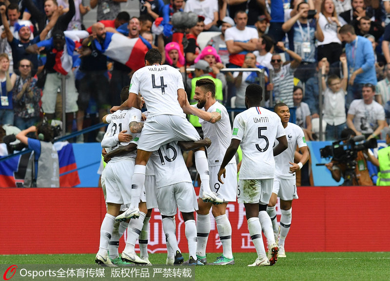 人民网北京7月6日电(杨乔栋)北京时间7月6日晚22点,2018俄罗斯世界杯1/4决赛的首场对决、法国对阵乌拉圭的比赛在下诺夫哥罗德体育场打响。上半场比赛,格列兹曼任意球助攻瓦拉内头球破门,法国1-0领先乌拉圭。下半场,格列兹曼的禁区外远射,造成穆斯莱拉扑球脱手,2-0。最终,全场比赛结束,法国以2-0的比分淘汰乌拉圭,杀入本届世界杯四强。(Osports全体育传媒专供人民体育 版权作品 严禁转载)