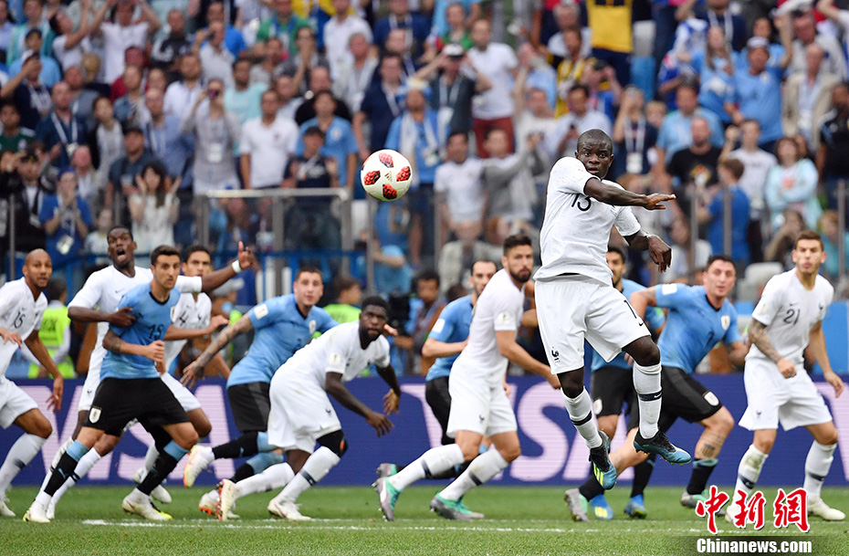 北京时间7月6日晚22:00,俄罗斯世界杯第一场1/4决赛在下诺夫哥罗德球场率先打响,凭借着格里兹曼的一传一射和瓦拉内的进球,法国队以2:0战胜乌拉圭队,晋级四强。 中新社记者 毛建军 摄
