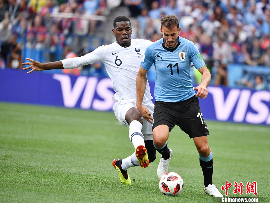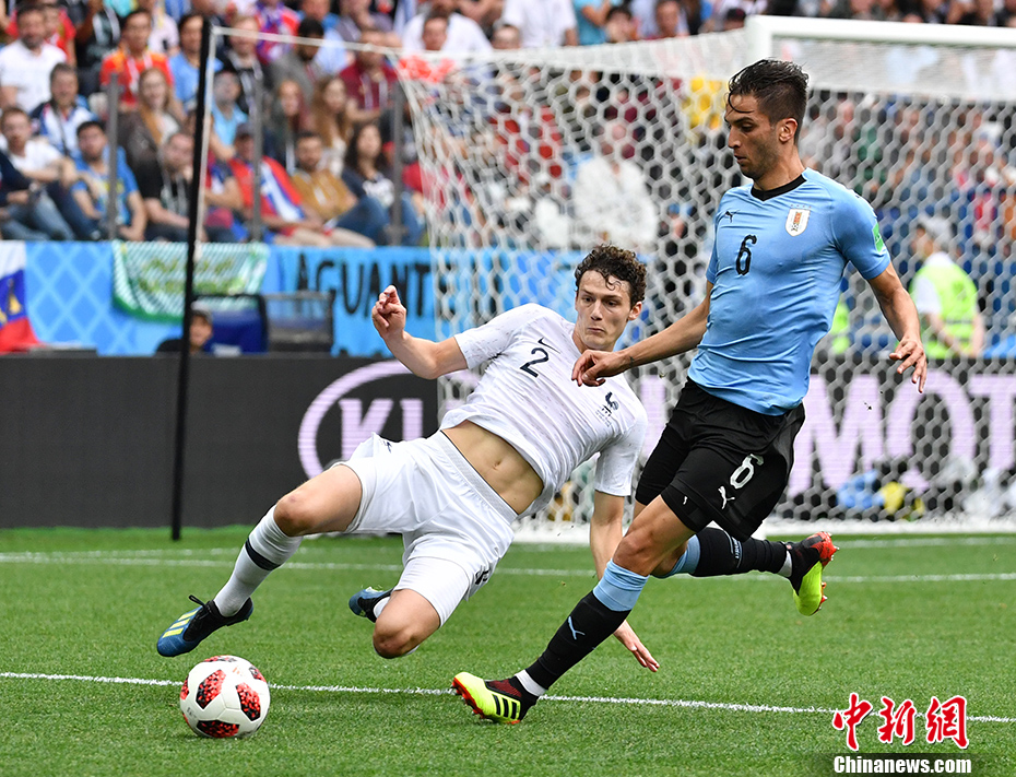 北京时间7月6日晚22:00,俄罗斯世界杯第一场1/4决赛在下诺夫哥罗德球场率先打响,凭借着格里兹曼的一传一射和瓦拉内的进球,法国队以2:0战胜乌拉圭队,晋级四强。 中新社记者 毛建军 摄