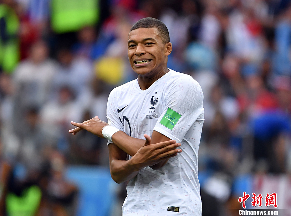 开场后乌拉圭人进入状态很快,第5分钟,苏亚雷斯前场分球,斯图亚尼在禁区内右侧的小角度抽射偏出球门。第15分钟,法国队获得好机会,帕瓦尔右路起球,吉鲁摆渡到中路,跟上的姆巴佩在无人看防的情况下将球顶高。图为姆巴佩在赛场上。 中新社记者 毛建军 摄