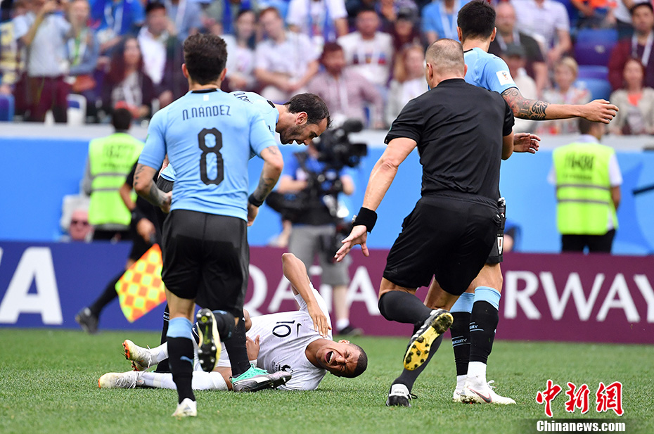 落后两球的乌拉圭队员情绪较为急躁,第66分钟,场上发生争议性一幕,姆巴佩接球后用了一个杂耍的动作传球,罗德里格斯随后用一个隐蔽的动作将其击倒在地,乌拉圭队长戈丁也对姆巴佩表示非常不满,场上引发冲突。随后裁判向姆巴佩和罗德里格斯一人出示一张黄牌。 中新社记者 毛建军 摄