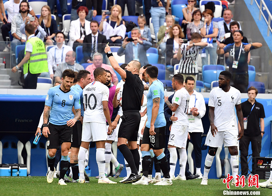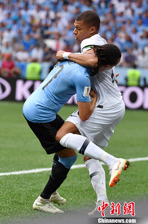 落后两球的乌拉圭队员情绪较为急躁,第66分钟,场上发生争议性一幕,姆巴佩接球后用了一个杂耍的动作传球,罗德里格斯随后用一个隐蔽的动作将其击倒在地,乌拉圭队长戈丁也对姆巴佩表示非常不满,场上引发冲突。随后裁判向姆巴佩和罗德里格斯一人出示一张黄牌。 中新社记者 毛建军 摄