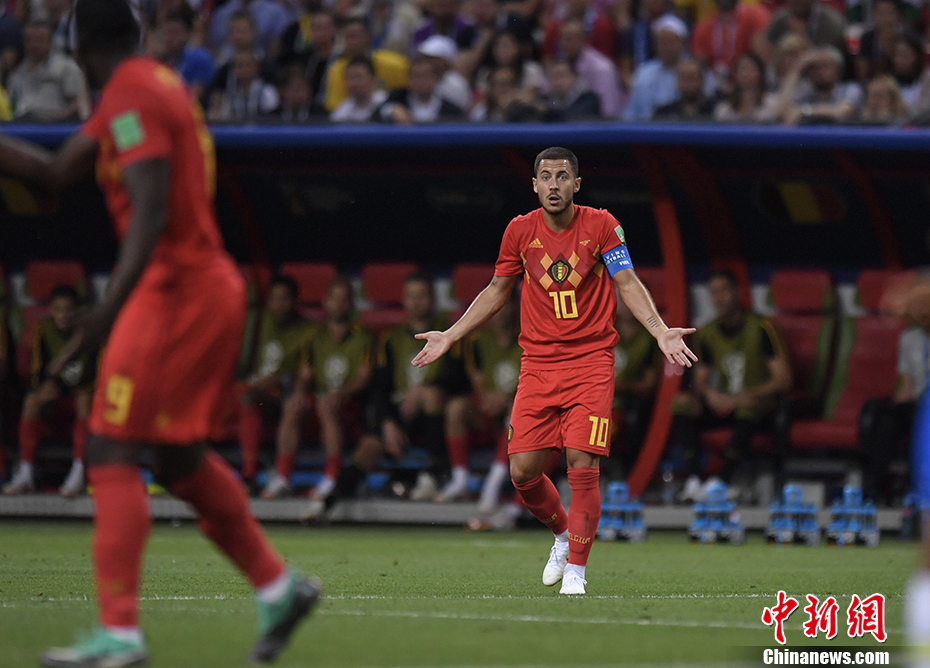 下半场巴西队明显加强了进攻火力,球队用菲尔米诺换下威廉。第55分钟,热苏斯一个穿裆过掉维尔通亨,禁区内被孔帕尼铲倒,不过裁判通过VAR系统认定并不是点球。图为阿扎尔在赛场上。 中新社记者 田博川 摄
