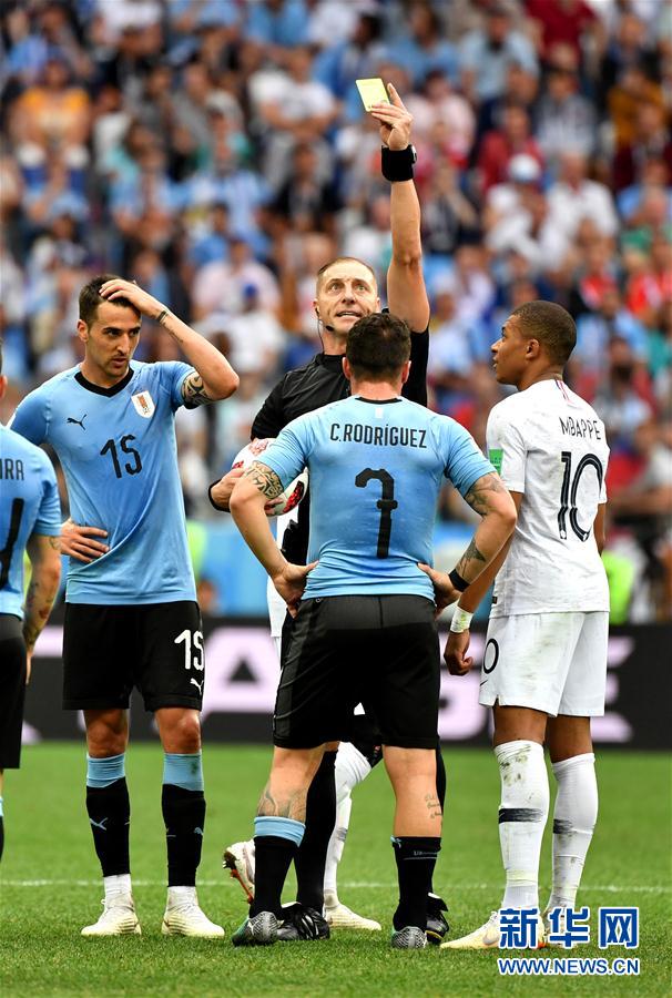 7月6日,乌拉圭队球员克·罗德里格斯(右二)被主裁判出示黄牌。当日,在下诺夫哥罗德进行的2018俄罗斯世界杯足球赛四分之一决赛中,乌拉圭队以0比2不敌法国队,无缘四强。 新华社记者刘大伟摄