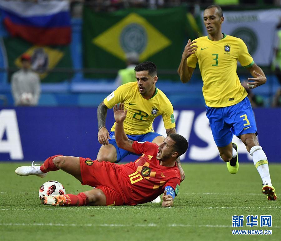 7月6日,比利时队球员埃·阿扎尔(下)与巴西队球员法格纳(上左)在比赛中拼抢。当日,在喀山进行的2018俄罗斯世界杯四分之一决赛中,比利时队以2比1战胜巴西队,晋级四强。 新华社记者贺灿铃摄