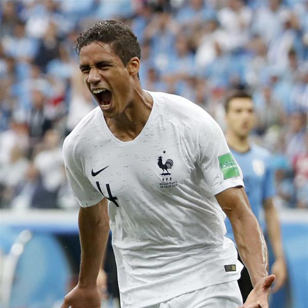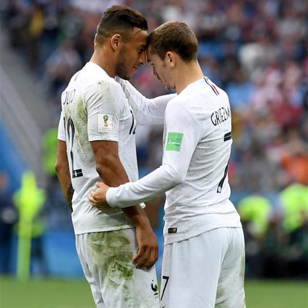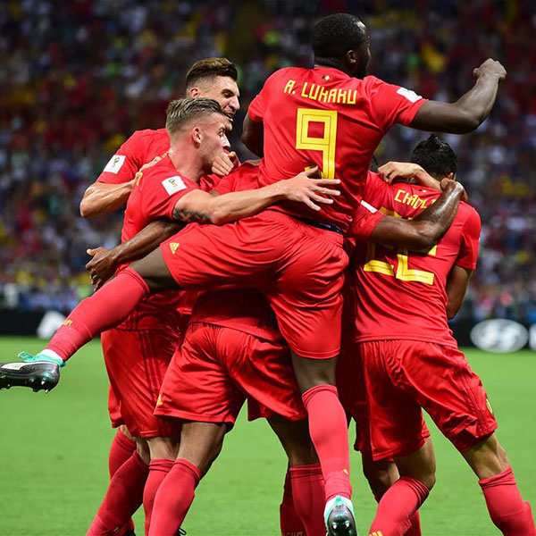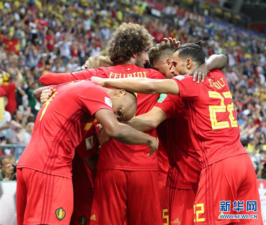 7月6日,比利时队球员庆祝队友德布劳内进球。 当日,在喀山进行的2018俄罗斯世界杯足球赛四分之一决赛中,比利时队对阵巴西队。新华社记者白雪骐摄