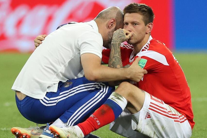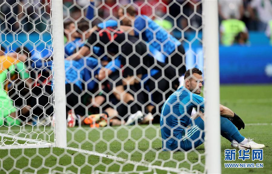 7月7日,俄罗斯队守门员阿金费耶夫在比赛后情绪低落。当日,在索契进行的2018俄罗斯世界杯足球赛四分之一决赛中,俄罗斯队与克罗地亚队在120分钟内战成2比2平。经过点球大战,俄罗斯队以总比分5比6不敌克罗地亚队,无缘四强。新华社记者曹灿摄