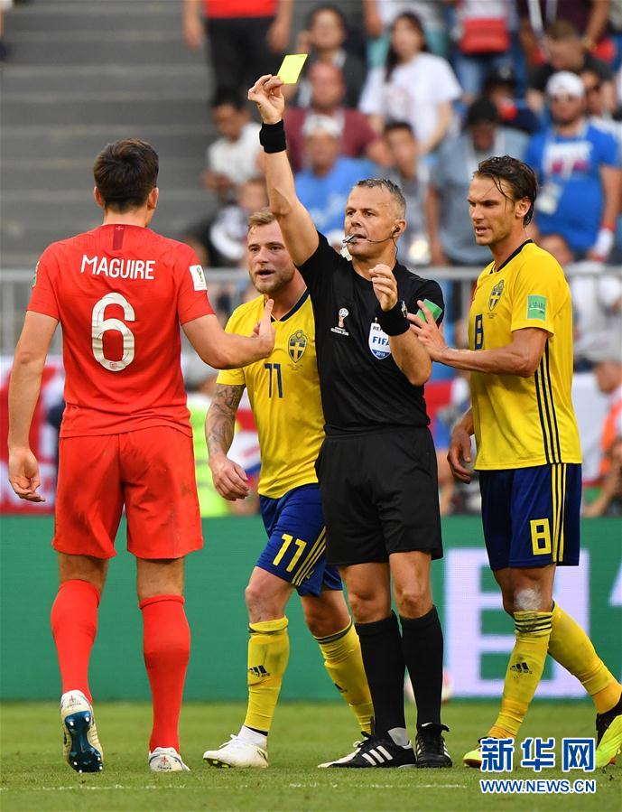7月7日,主裁判在比赛中向英格兰队球员马奎尔(左一)出示黄牌。当日,在萨马拉进行的2018俄罗斯世界杯足球赛四分之一决赛中,英格兰队以2比0战胜瑞典队,晋级四强。 新华社记者李尕摄