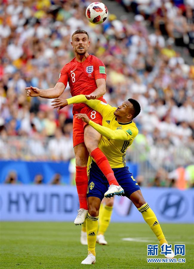 7月7日,英格兰队球员亨德森(上)与瑞典队球员马·奥尔松在比赛中拼抢。当日,在萨马拉进行的2018俄罗斯世界杯足球赛四分之一决赛中,英格兰队以2比0战胜瑞典队,晋级四强。 新华社记者李尕摄