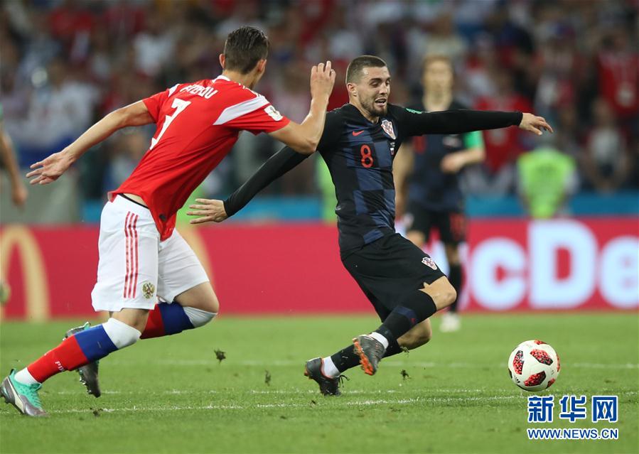 7月7日,克罗地亚队球员科瓦契奇(右)与俄罗斯队球员库捷波夫在比赛中拼抢。当日,在索契进行的2018俄罗斯世界杯足球赛四分之一决赛中,克罗地亚队与俄罗斯队在120分钟内战成2比2平。经过点球大战,克罗地亚队以总比分6比5战胜俄罗斯队,晋级四强。新华社记者吴壮摄
